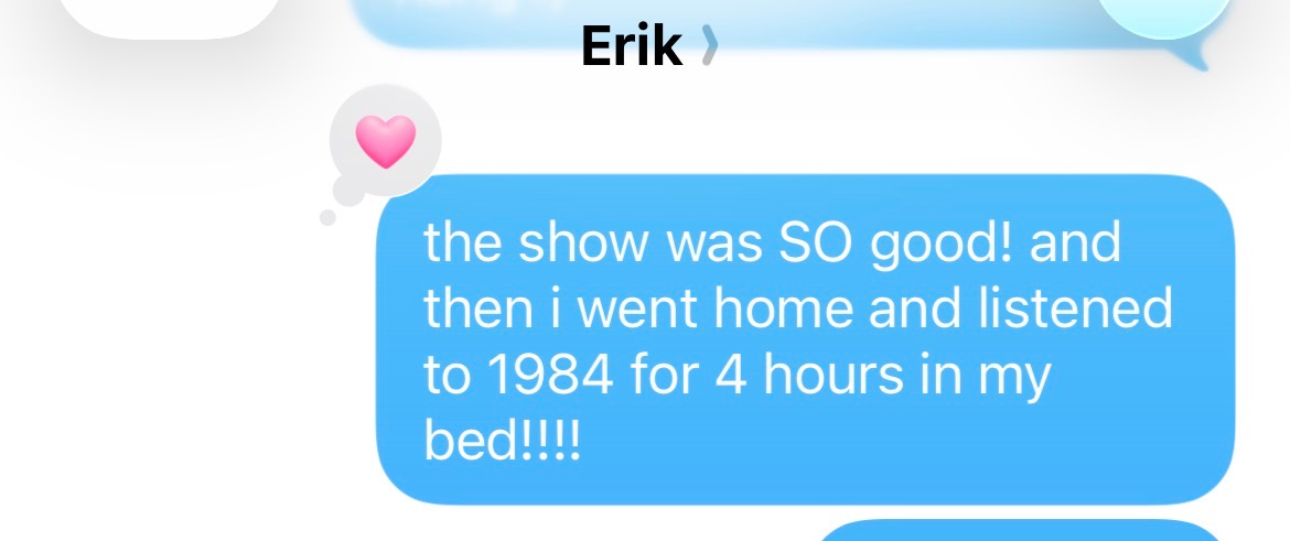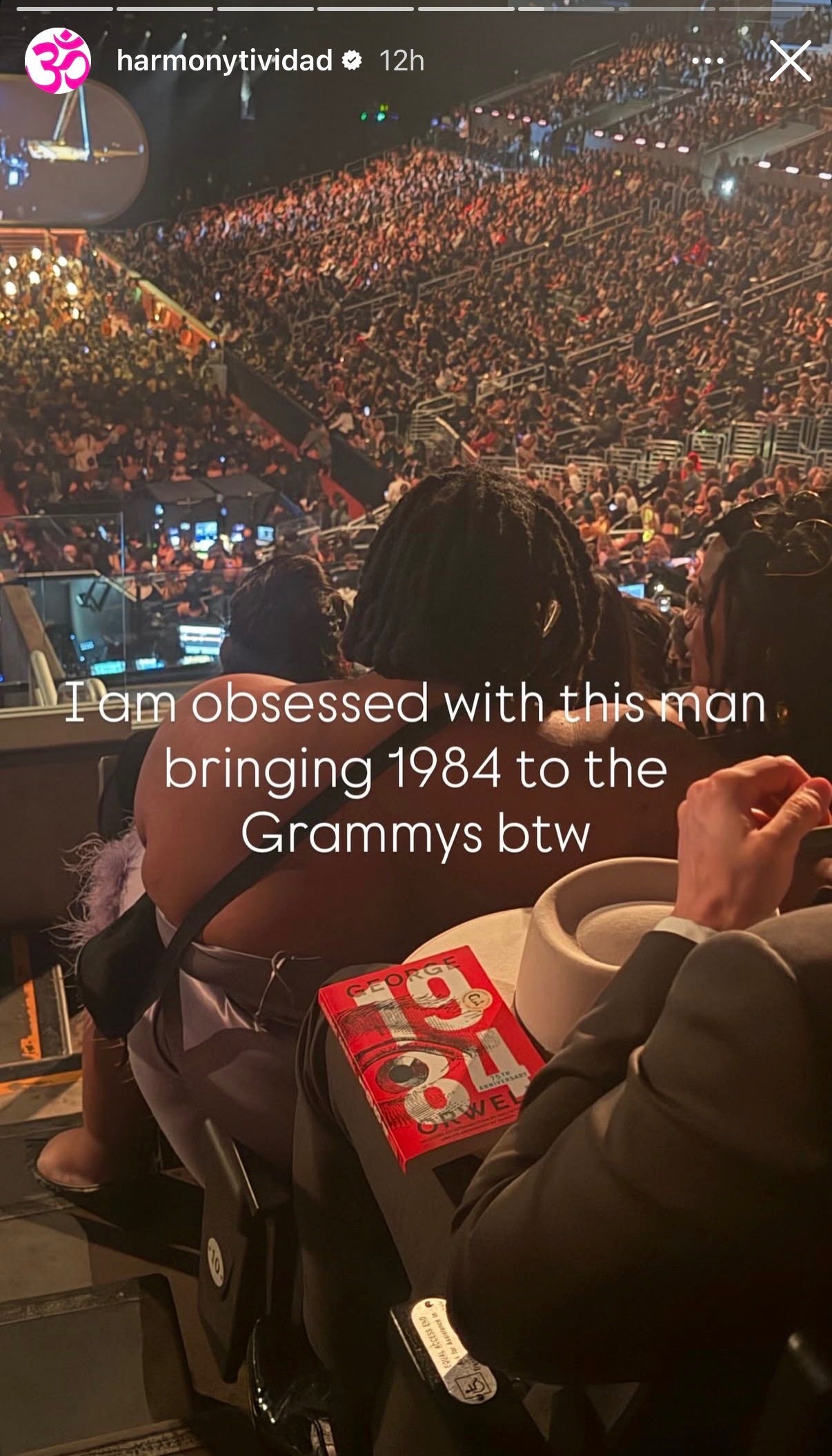Alyssa Vingan sent us a dispatch that she’s had two girls tell her they’re rereading 1984 in the past month, and then spotted it on Harmony Tividad’s post from the Grammys. Sophia listened in January 2024 to get her out of a depression slump and found it extremely erotic. Are you reading?? Let us know…